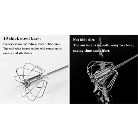 1.Semi-automatic whisk: The semi-automatic stainless steel whip automatic rotation is a miracle design in the kitchen. It saves effort while getting the job done much faster than a regular whisk without using electricity. nor battery. Simply squeeze the handle and the stainless steel blades of the whisk spin, no more wrist spinning! The ergonomic handle provides a secure and comfortable grip for any mixing task.