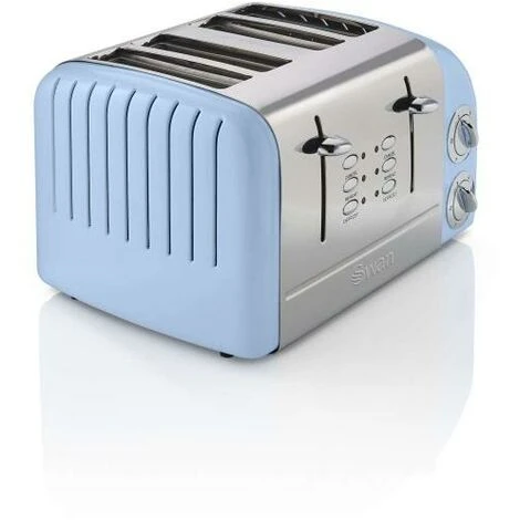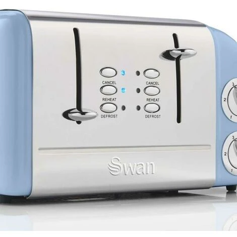 The Swan ST34020BLN is a blue, 1950’s Retro-Style, 4 slice toaster which has lots of features for such a small appliance! It comes with 6 time settings, re-heat defrost and cancel functions, cord storage and a removable crumb tray for easy clean-up.