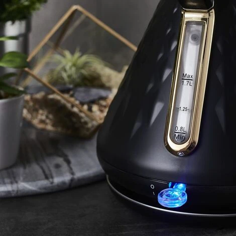 The Swan Gatsby 1.7L Pyramid Kettle is the perfect addition to any kitchen. Its chic and stylish design, coupled with its impressive functions, fast heat up, and generous capacity make making a cuppa almost as enjoyable as drinking it. The generous capacity means it can boil enough water for up to 8 cups of tea, coffee, or hot chocolate at once, perfect for busy households or unexpected guests. The powerful 3KW concealed heating element heats up water fast, so you can have a lovely hot drink in no time. The pull off lid and transparent water gauge on the side allow for easy and accurate filling. An indicator lamp shows when the kettle is boiling, and boil-dry protection ensures your safety. The cordless design and 360-degree rotational base offer maximum usability whether you’re left or right-handed and means you can return it to its base without hassle. The chic and sophisticated design, pyramid shape with matte black housing, diamond detailing and gold accents helps make a statement in any kitchen.