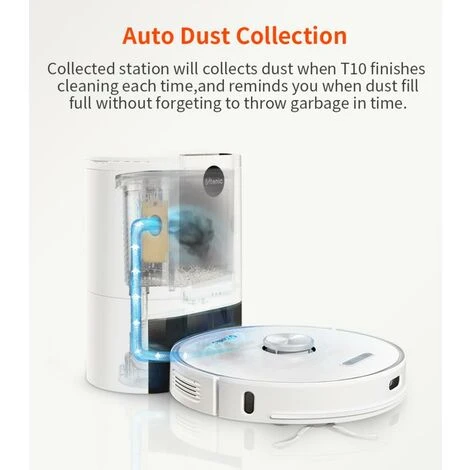3000Pa Strong Suction PowerWith the high suction power, the robot vacuum can easily pick up dog food and coffee beans, and handle most of your housework. | Free your hands up to 60 daysThe dust collector automatically empties the robot’s dustbin into a disposable bag at a frequency you set. 4.3L large capacity dust bag can hold up to 60 days of dust, debris, and pet hair. The bag automatically seals when you take it off, ensuring you can easily discard it without getting your hands dirty. It’s ideal for allergic people. | Long-lasting battery5200mAh lithium-ion battery provides up to 280mins of constant cleaning on a single full charge, easily covering 2690 square feet. |