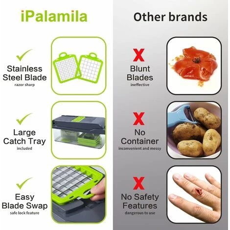 8 interchangeable blades: vegetable cutter cutting machine includes 8 different sizes of fruit cutting blades, multifunctional cutter can make small to medium cubes or bars, and quarter more than one variant. The rust-proof 420 stainless steel of the onion cutter ensures sharp, smooth cutting edges, and the cutting blades are easily accessible and durable – the perfect tool to make cooking at home easier and faster
