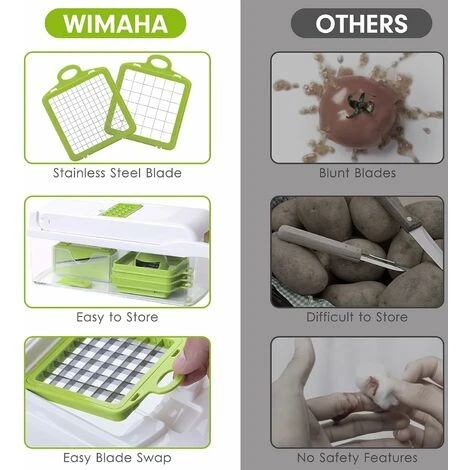 1. 【Premium Quality】 Upgrades the multifunctional chopper and slicer to help you chop, dice, slice or grate easily. Manufactured with premium materials quality: stainless steel blades sufficiently sharp and food grade material.